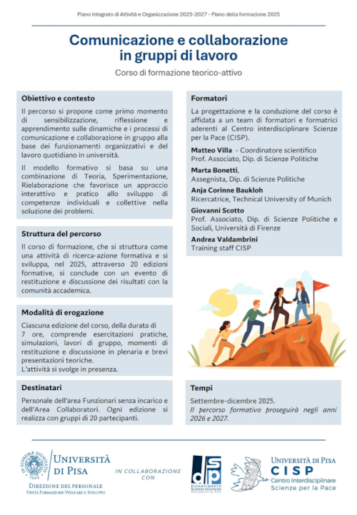 Il corso di formazione teorico-attivo, destinato al personale area Funzionari senza incarico ed area Collaboratori, si propone come primo momento di sensibilizzazione, riflessione e apprendimento sulle dinamiche e i processi di comunicazione e collaborazione in gruppo alla base dei funzionamenti organizzativi e del lavoro quotidiano in università.