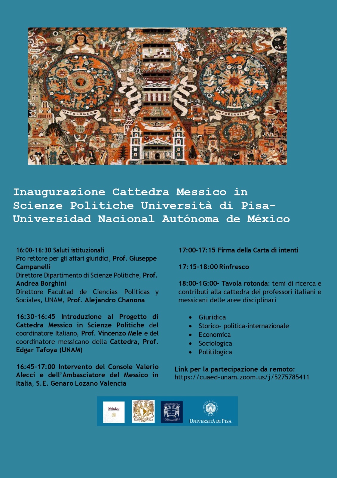 Venerdì 14 novembre si terrà l’inaugurazione accademica della Cattedra Messico in Scienze politiche Università di Pisa – Universidad Nacional Autónoma de México. Alla tavola rotonda parteciperanno (online) anche i colleghi messicani delle varie aree disciplinari che compongono la facoltà.
