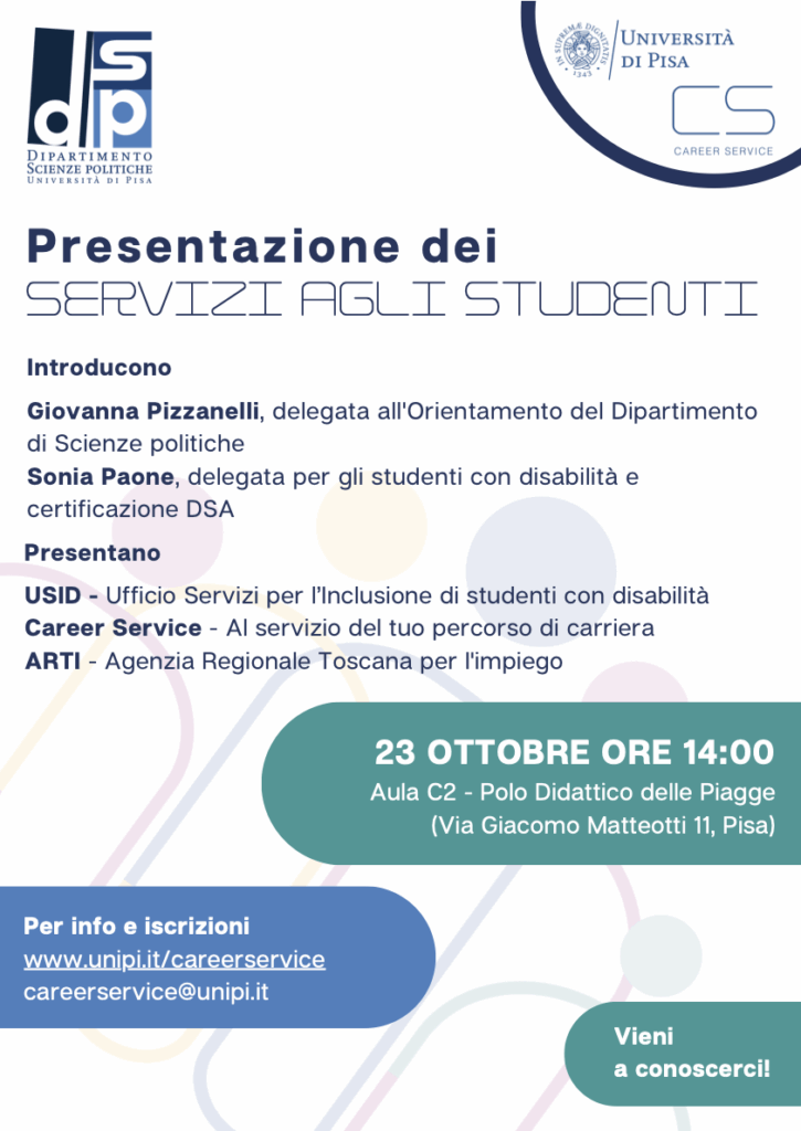 Il 23 ottobre 2025 il Career Service e l’Unità Orientamento e Sostegno Studenti dell’Ateneo, in collaborazione con il Dipartimento di Scienze politiche, organizza una giornata di presentazione dei servizi e delle iniziative a disposizione degli studenti e le studentesse.