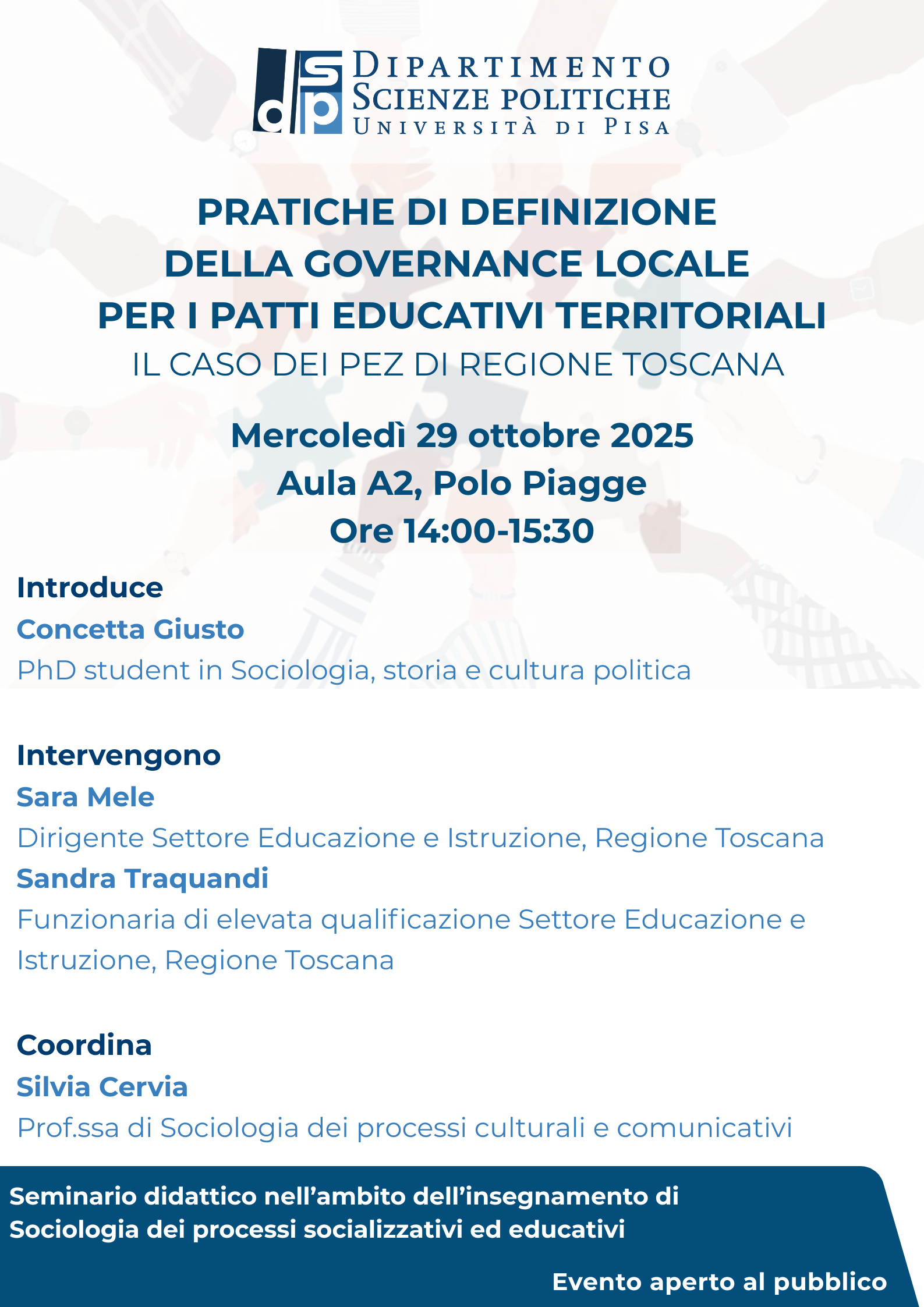 ![]() Il Dipartimento di Scienze politiche vi invita a partecipare all’evento UniPi-Orienta 2025. Un’occasione unica per conoscere i percorsi formativi e le opportunità |