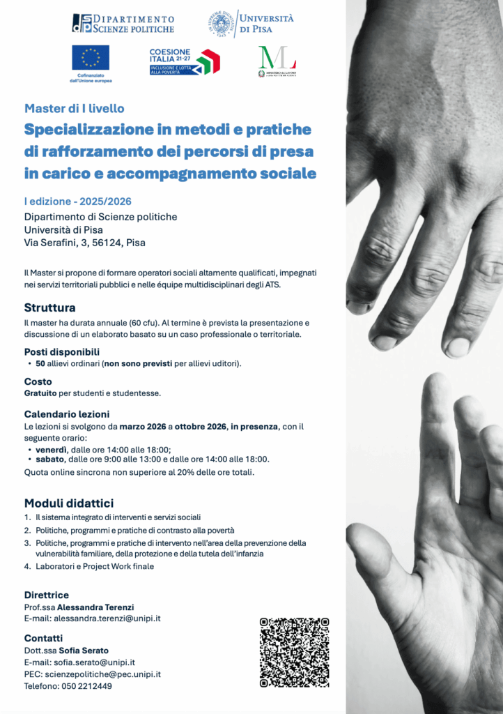 Sono aperte le iscrizioni al nuovo Master di I livello in “Specializzazione in metodi e pratiche di rafforzamento dei percorsi di presa in carico e accompagnamento sociale”, gratuito per tutti i partecipanti.