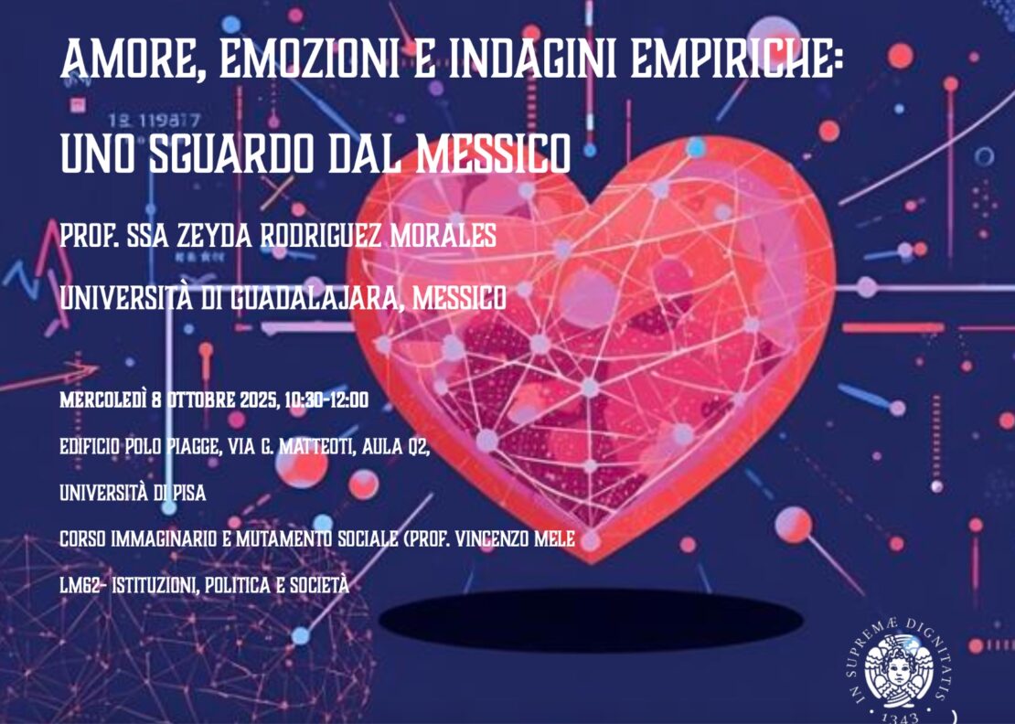 Mercoledì 8 ottobre, nell’ambito del corso di Immaginario e mutamento sociale, si terrà la lezione della Prof.ssa Zeyda Rodriguez dell’Università di Guadalajara (Messico) dal titolo “Amore, emozioni e indagini empiriche: uno sguardo al Messico”.