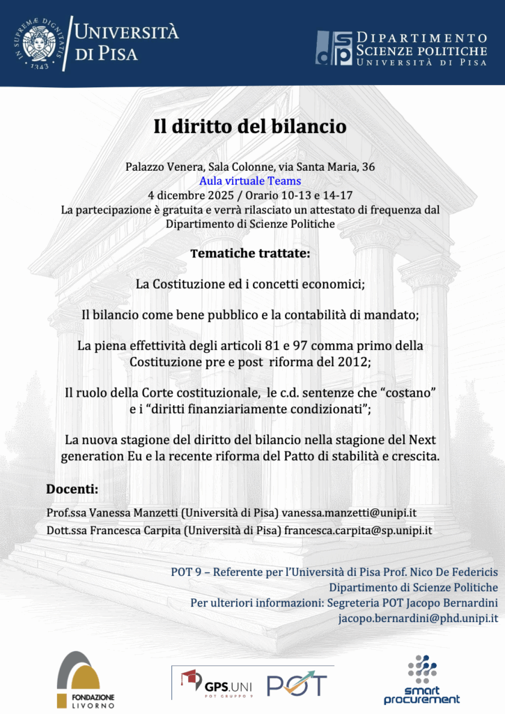 Giovedì 4 dicembre si svolgerà il corso di formazione per docenti delle scuole superiori dedicato a Il diritto del bilancio. Il corso si inserisce tra le azioni E del POT 9, e sarà tenuto dalla Prof.ssa Vanessa Manzetti e dalla Dr.ssa Francesca Carpita.
