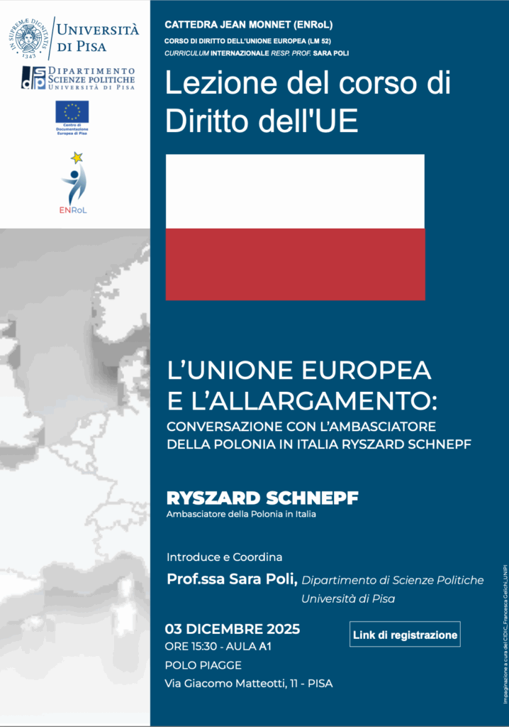 Mercoledì 3 dicembre 2025, alle ore 15:30, presso l’aula A1 del Polo Didattico delle Piagge, si terrà la lezione del Corso di Diritto dell’UE dal titolo “L’Unione Europea e l’allargamento: conversazione con l’Ambasciatore della Polonia in Italia Ryszard Schnepf”.
