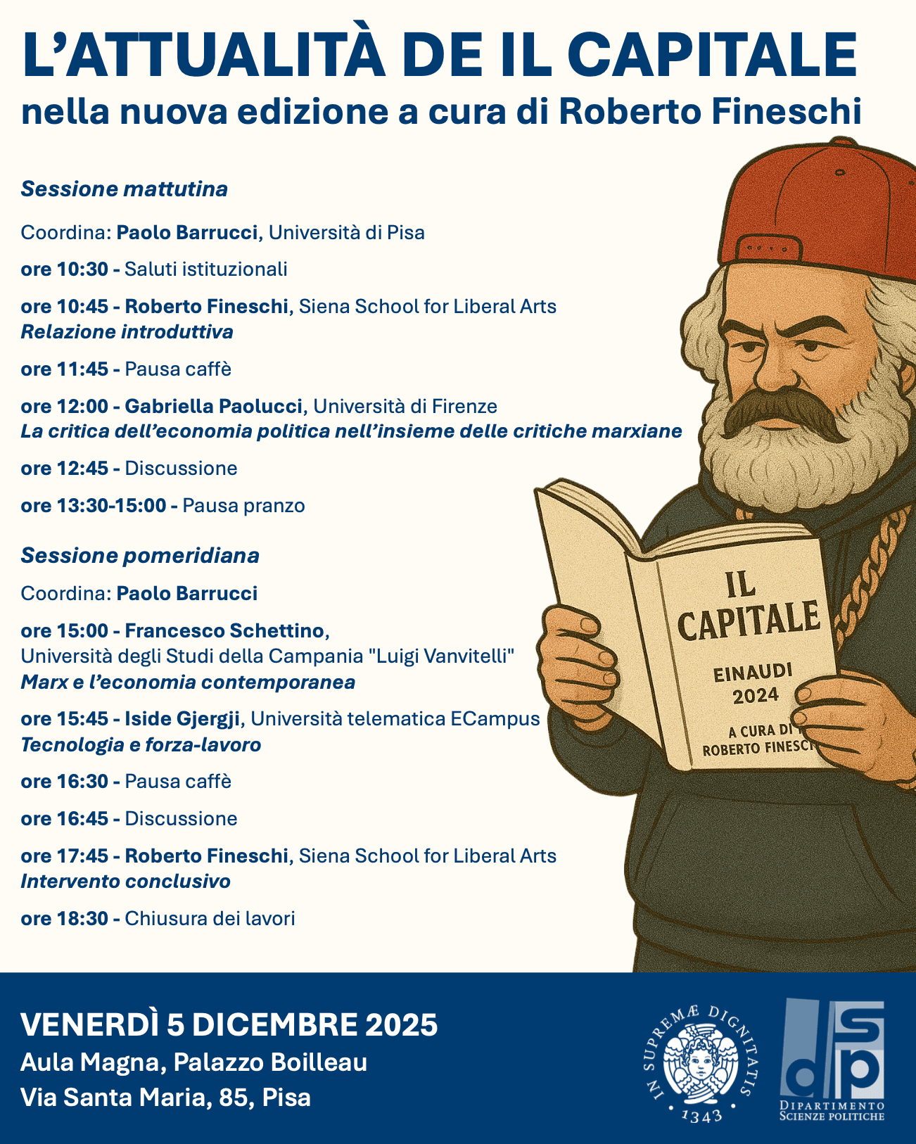 Il 5 dicembre 2025, alle ore 10:30, si terrà il convegno su Marx “L’attualità de Il capitale” nuova edizione a cura di Roberto Fineschi, coordinato dal Prof. Paolo Barrucci.
