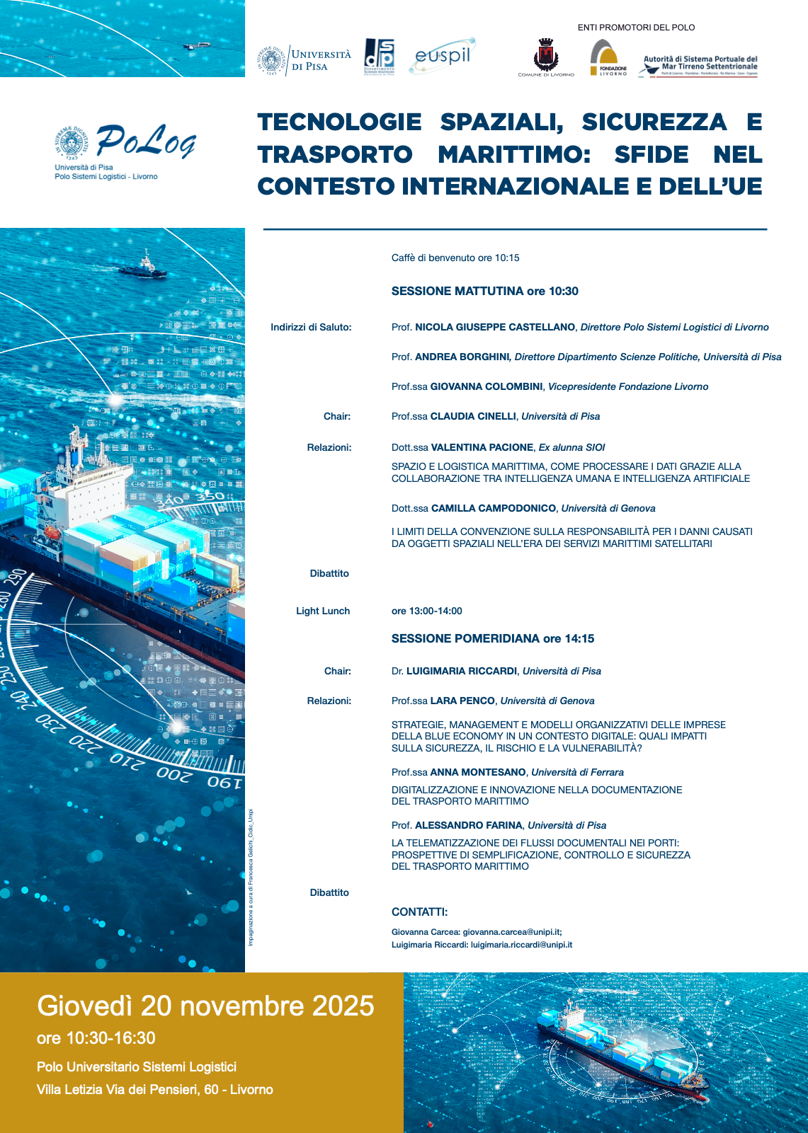 Il 20 novembre 2025, presso il Polo Universitario Sistemi Logistici di Livorno, si terrà il convegno dal titolo “Tecnologie spaziali, sicurezza e trasporto marittimo: sfide nel contesto internazionale e dell’UE“.
