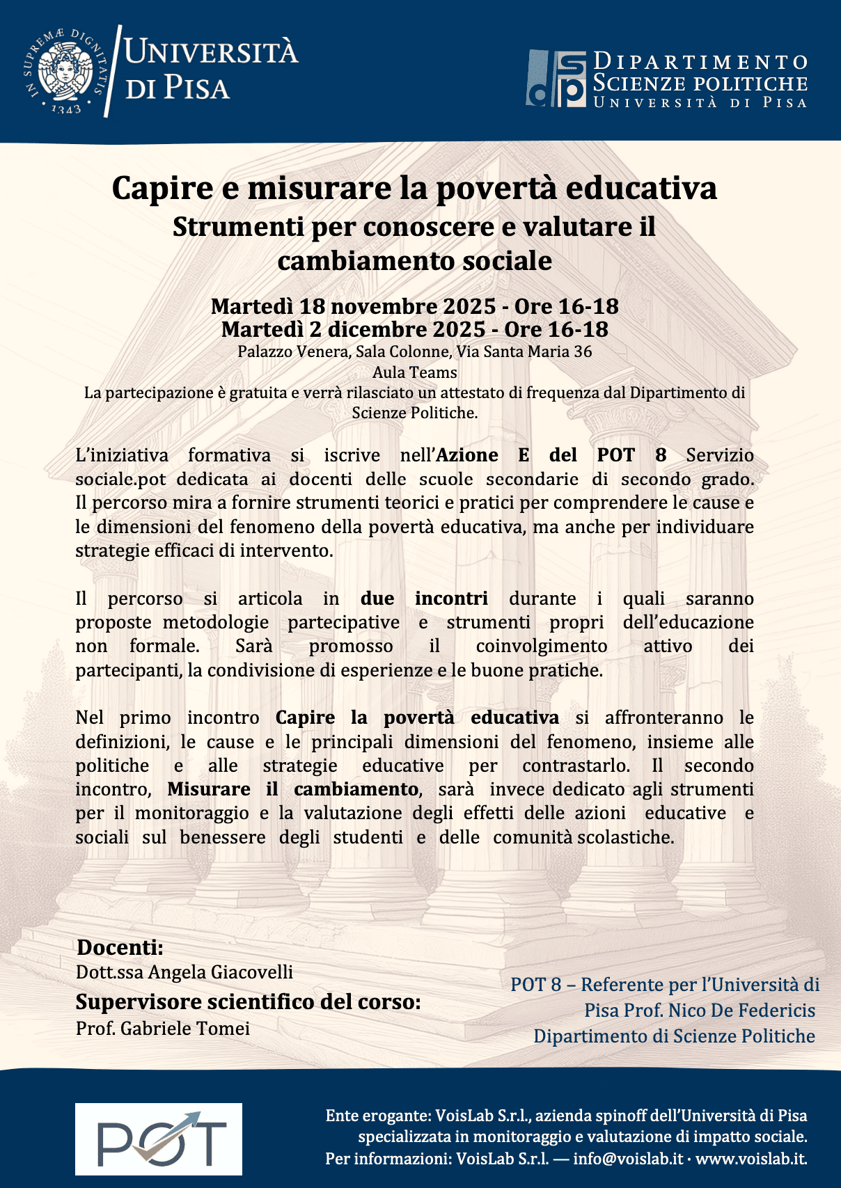 Il corso, promosso dal Dipartimento di Scienze politiche, in collaborazione con VoisLab S.r.l. (spin-off dell’Università di Pisa specializzata nella valutazione di impatto sociale), sarà condotto dalla Dott.ssa Angela Giacovelli, sociologa e psicologa con una lunga esperienza nella progettazione e valutazione di interventi socio-educativi.