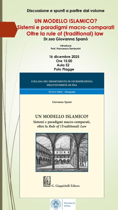Martedì 16 dicembre 2025, alle ore 15:00, nell’aula E2 del Polo Piagge, si terrà un incontro di discussione e approfondimento a partire dal volume Un modello islamico? Sistemi e paradigmi macro-comparati, oltre la Rule of (Traditional) Law della Dott.ssa Giovanna Spanò.