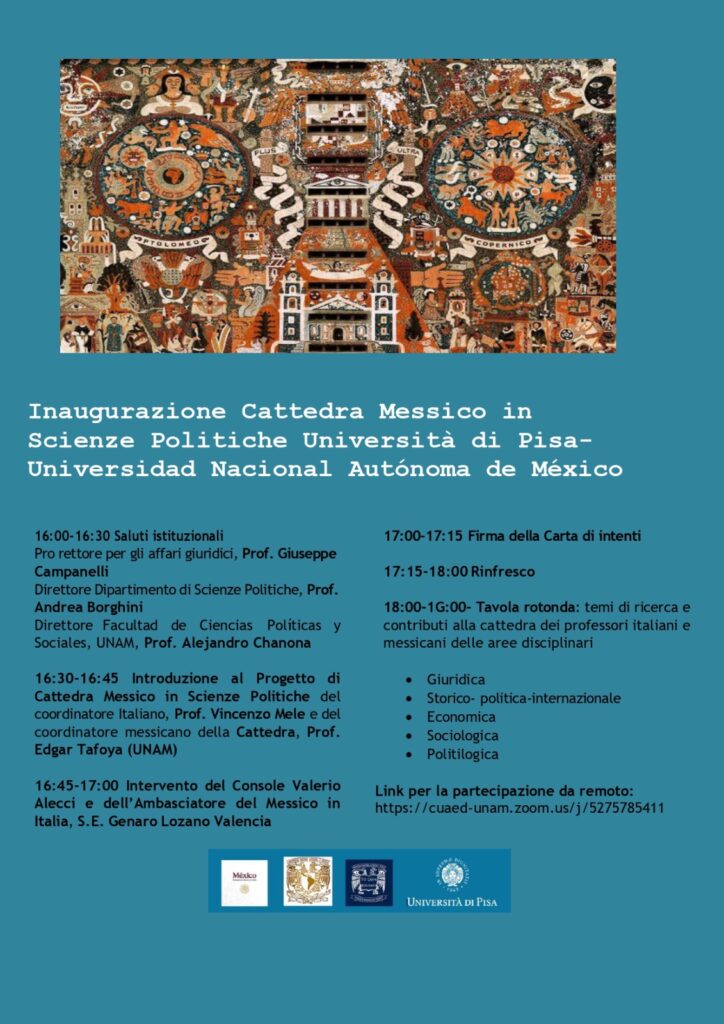 Venerdì 14 novembre 2025 si terrà l’inaugurazione accademica della Cattedra Messico in Scienze politiche Università di Pisa – Universidad Nacional Autónoma de México, presso Aula Magna Storica della Sapienza, dalle ore 16:00 alle 19:00.