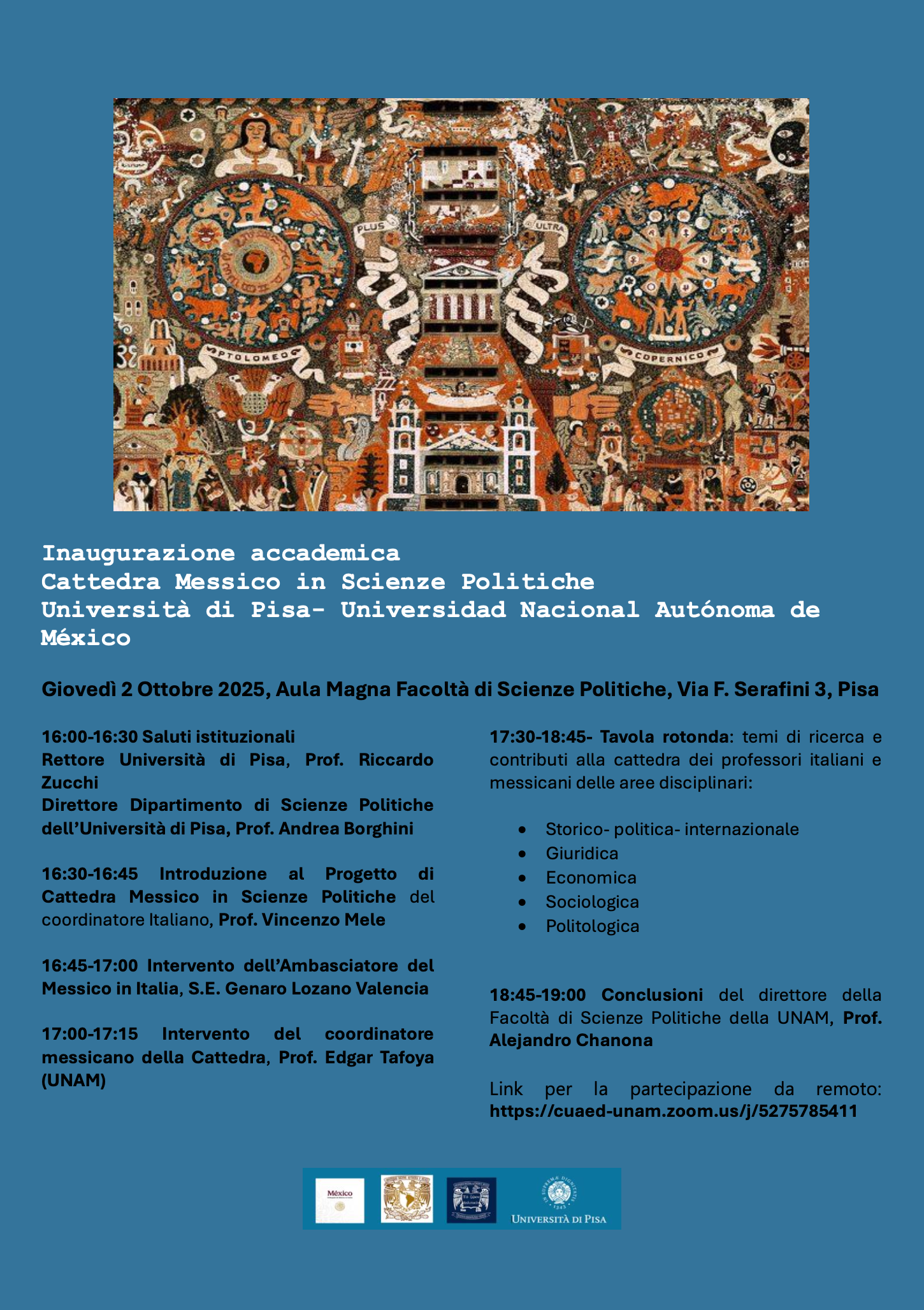 Giovedì 2 ottobre 2025, alle ore 16:00, presso l’Aula Magna del Dipartimento di Scienze politiche, si terrà l’inaugurazione accademica della Cattedra Messico in Scienze politiche, promossa dall’Università di Pisa in collaborazione con la Universidad Nacional Autónoma de México (UNAM).