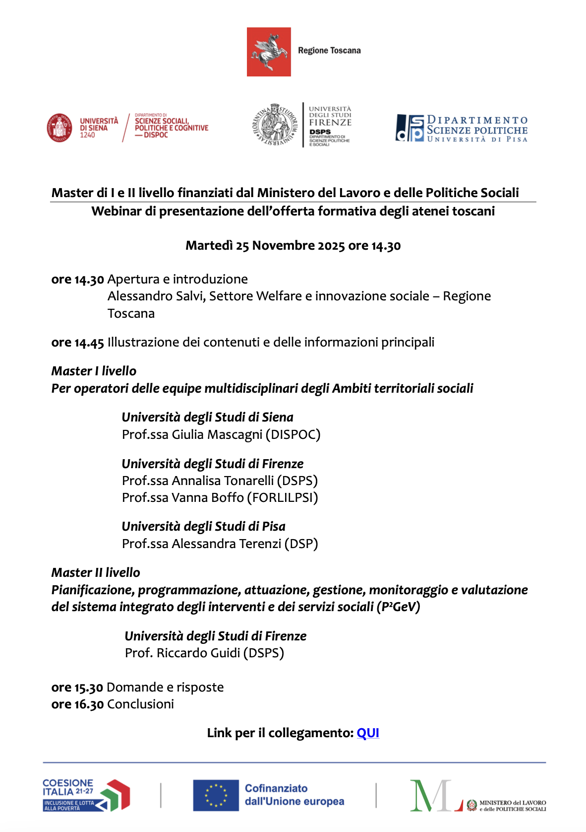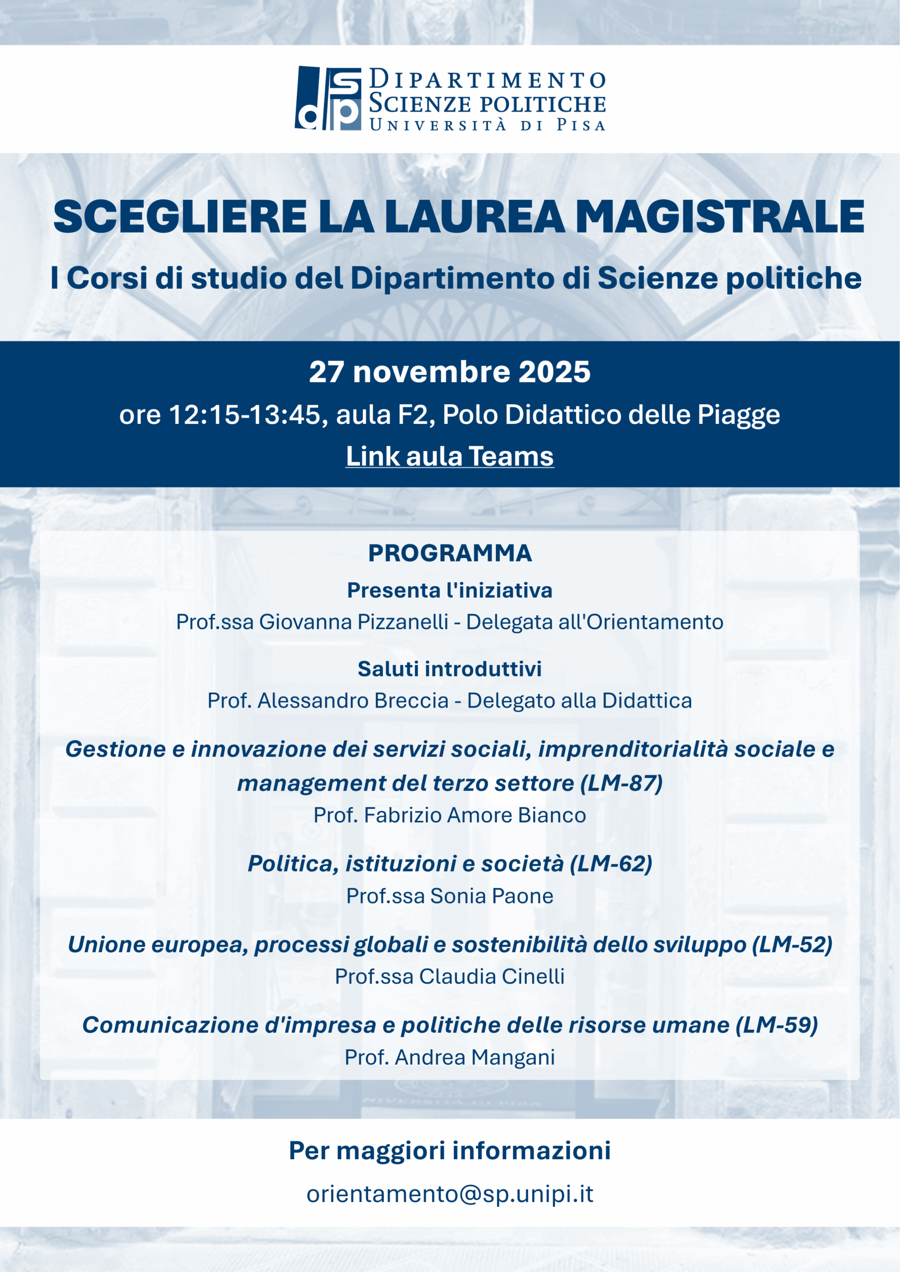 Il 27 novembre, presso il Polo Didattico delle Piagge, si terrà un incontro di orientamento dedicato ai Corsi di laurea magistrale del Dipartimento di Scienze politiche.
