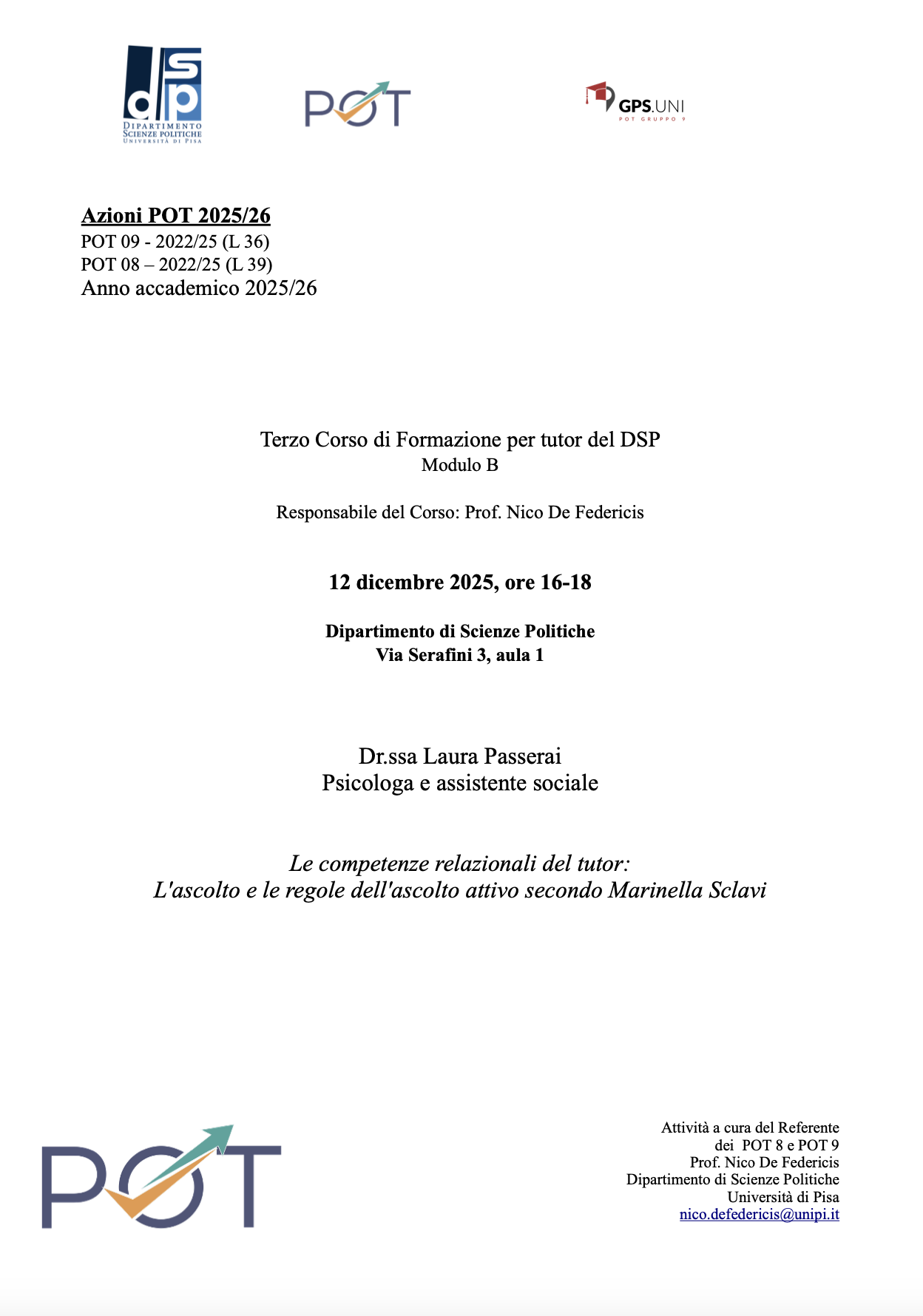 Venerdì 12 dicembre 2025, dalle ore 16:00 alle 18:00 (aula 1, via Serafini 3) si terrà il secondo modulo del Corso di formazione per tutor del Dipartimento di Scienze politiche (terza edizione 2025/26).