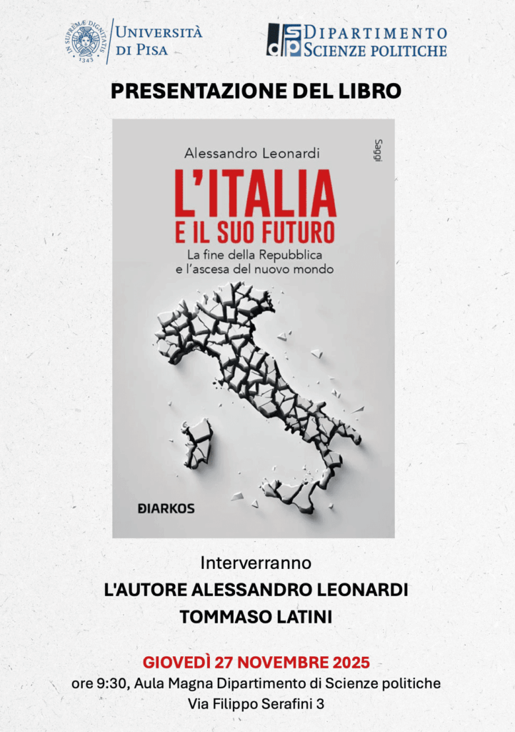 Il 27 novembre 2025, alle ore 9:30, presso l’Aula Magna del Dipartimento di Scienze politiche, si terrà la presentazione del libro “L’Italia e il suo futuro: La fine della Repubblica e l’ascesa del nuovo mondo” (Diarkos, 2025) di Alessandro Leonardi.