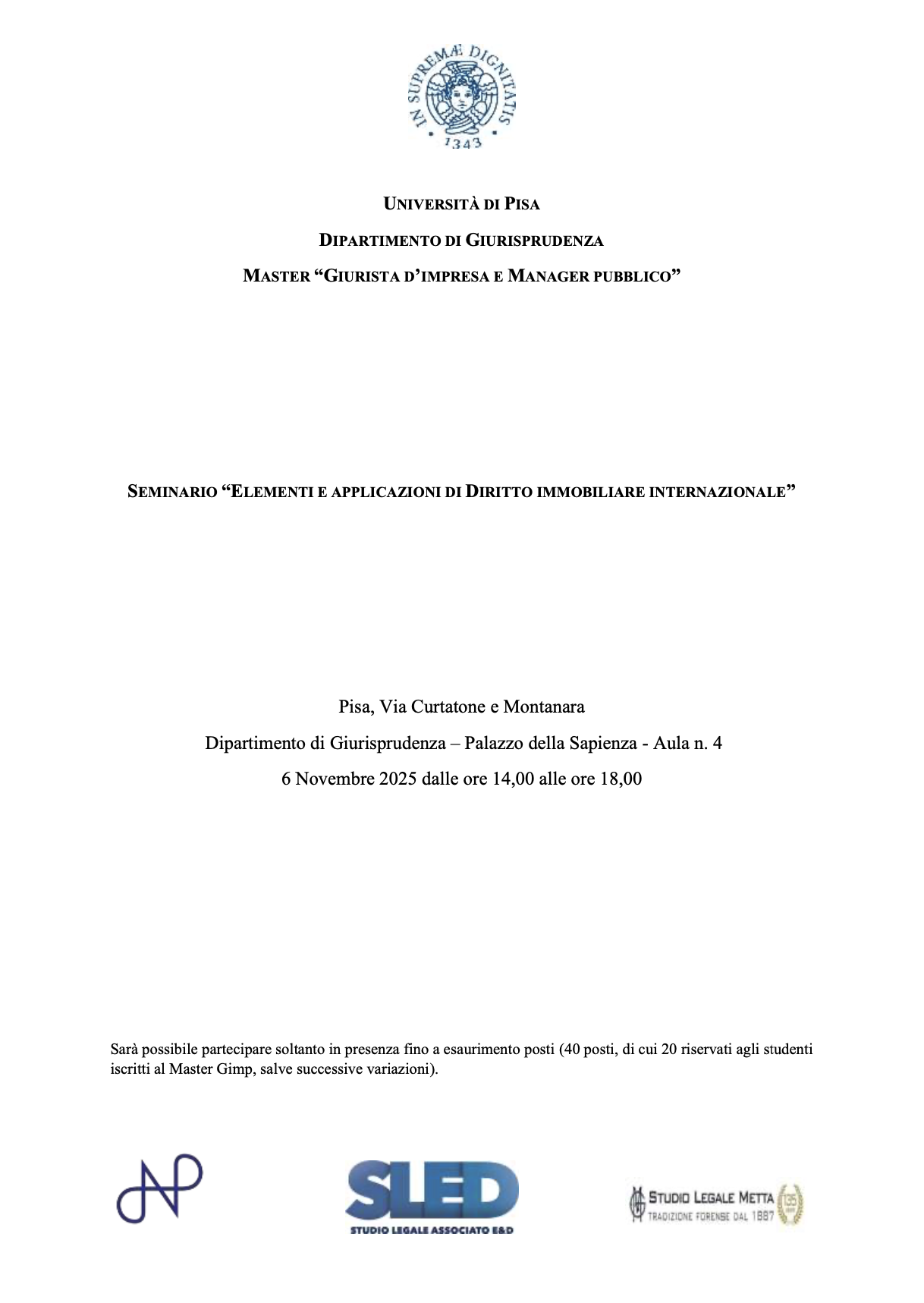 La partecipazione è consentita solo in presenza, fino a esaurimento posti (40 posti complessivi, di cui 20 riservati a studenti e studentesse iscritti/e al Master Gimp).