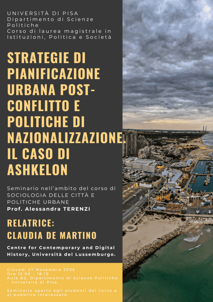 Il 27 novembre si terrà il seminario “Strategie di pianificazione urbana post-conflitto e politiche di nazionalizzazione. Il caso di Ashkelon” con la partecipazione di Claudia De Martino, Centre for Contemporary and Digital History, Università del Lussemburgo.