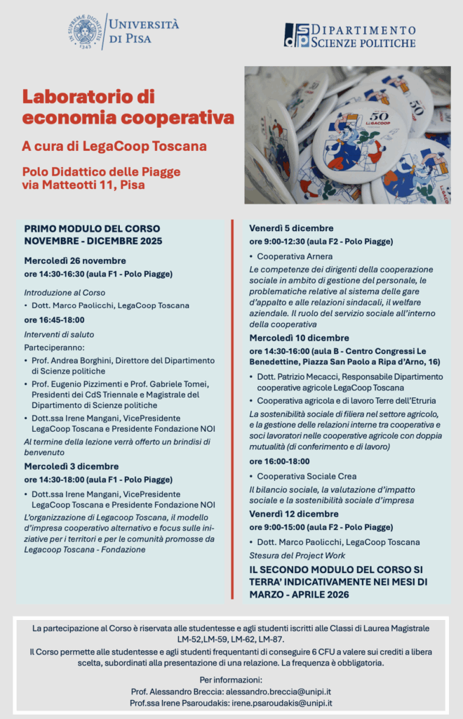 Il 26 novembre avrà inizio il Corso di economia cooperativa, una nuova attività didattica rivolta alle studentesse e agli studenti magistrali del Dipartimento. Coordinato dal dott. Marco Paolicchi (LegaCoop Toscana) sarà a frequenza obbligatoria e consentirà di conseguire 6 cfu a valere sui crediti a libera scelta dello studente.