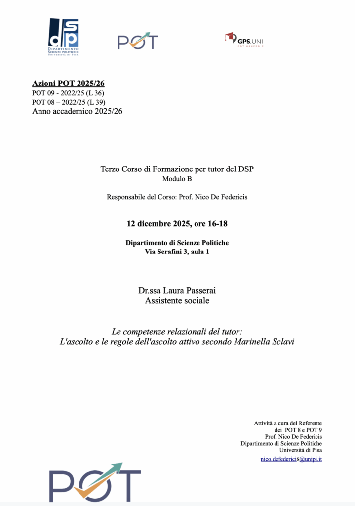 Il POT 8 Servizio Sociale.pot dell’Università di Pisa promuove un percorso di formazione rivolto ai Tutor impegnati nell’accoglienza dei neo-iscritti…